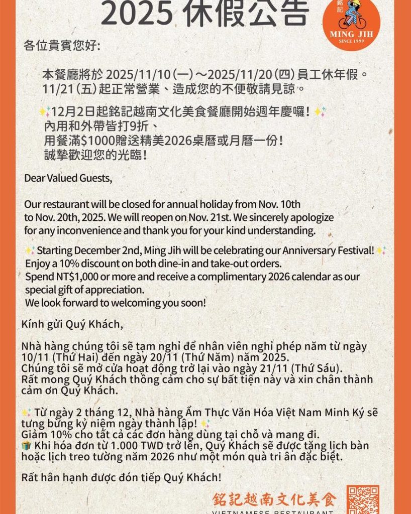 暖心預告12月2日起至12月底:開啓週年慶 感恩回饋活動! 內用、外帶全面9折、用餐滿$1000贈送限量特製越南風情精美2026桌曆或月曆一份!